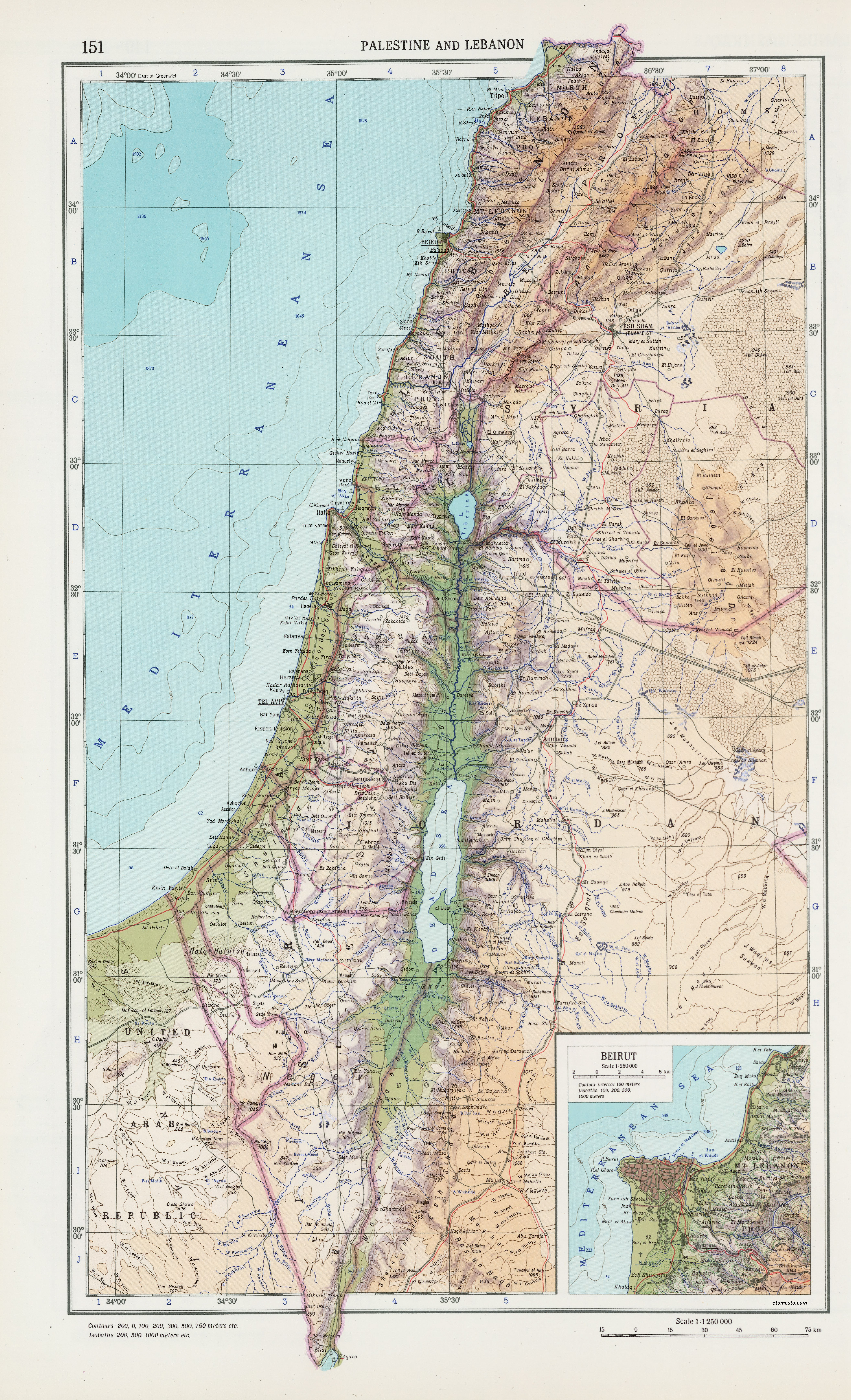 Map of the countries of the Levant from the 1954 Soviet World Atlas