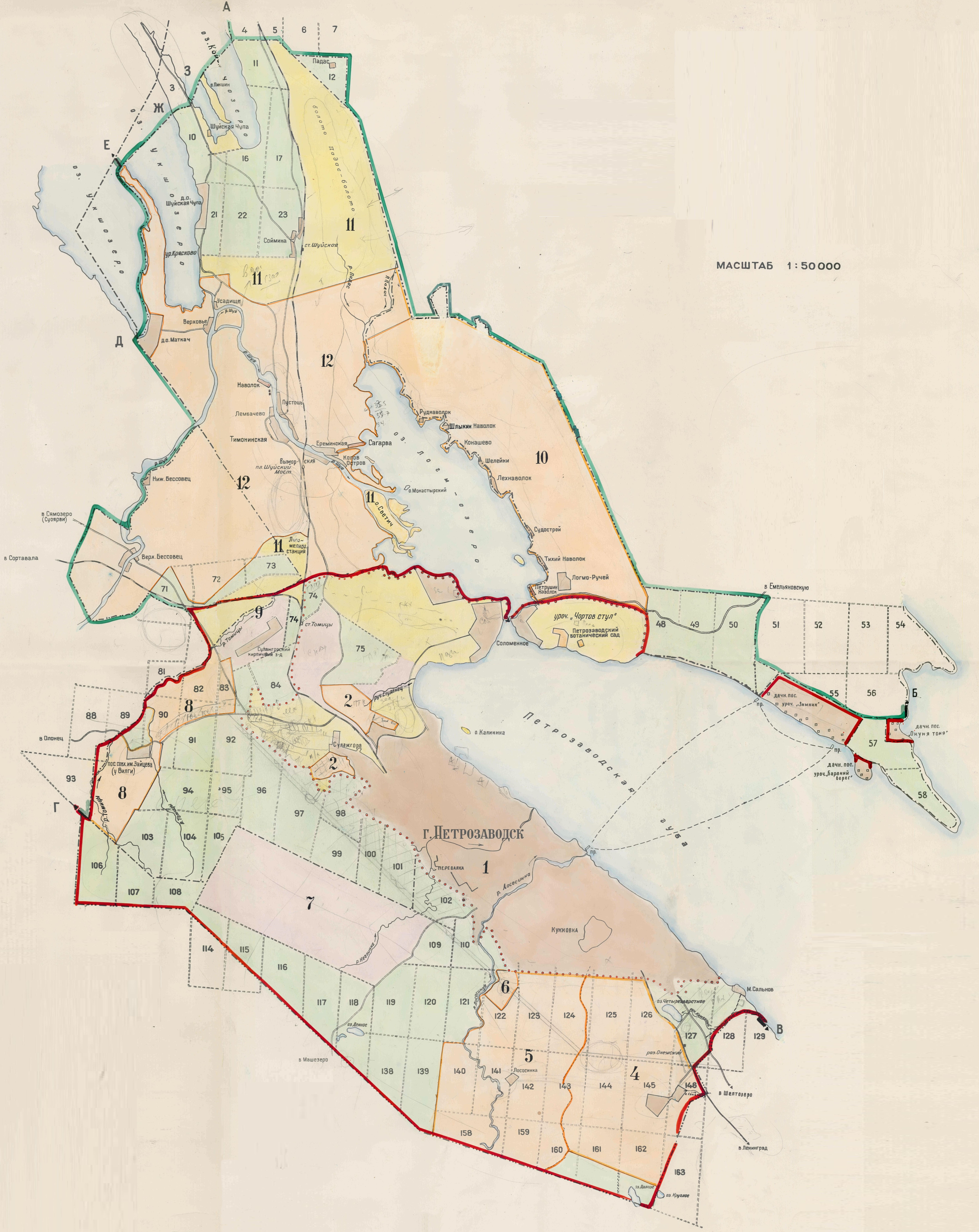 Scheme of forest districts of Petrozavodsk in 1958