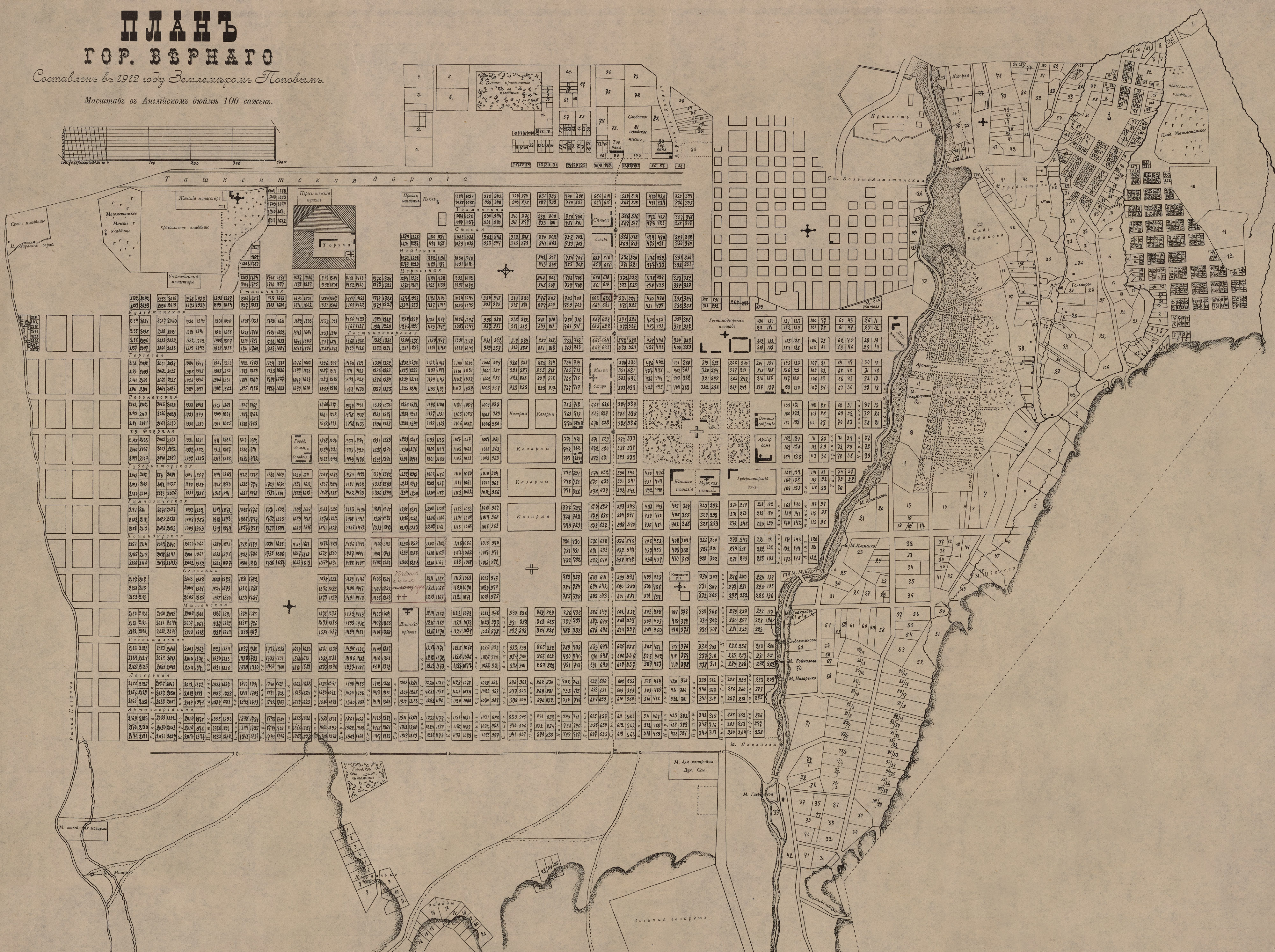 Plan of the city of Verny (Almaty) 1912 by surveyor Popov